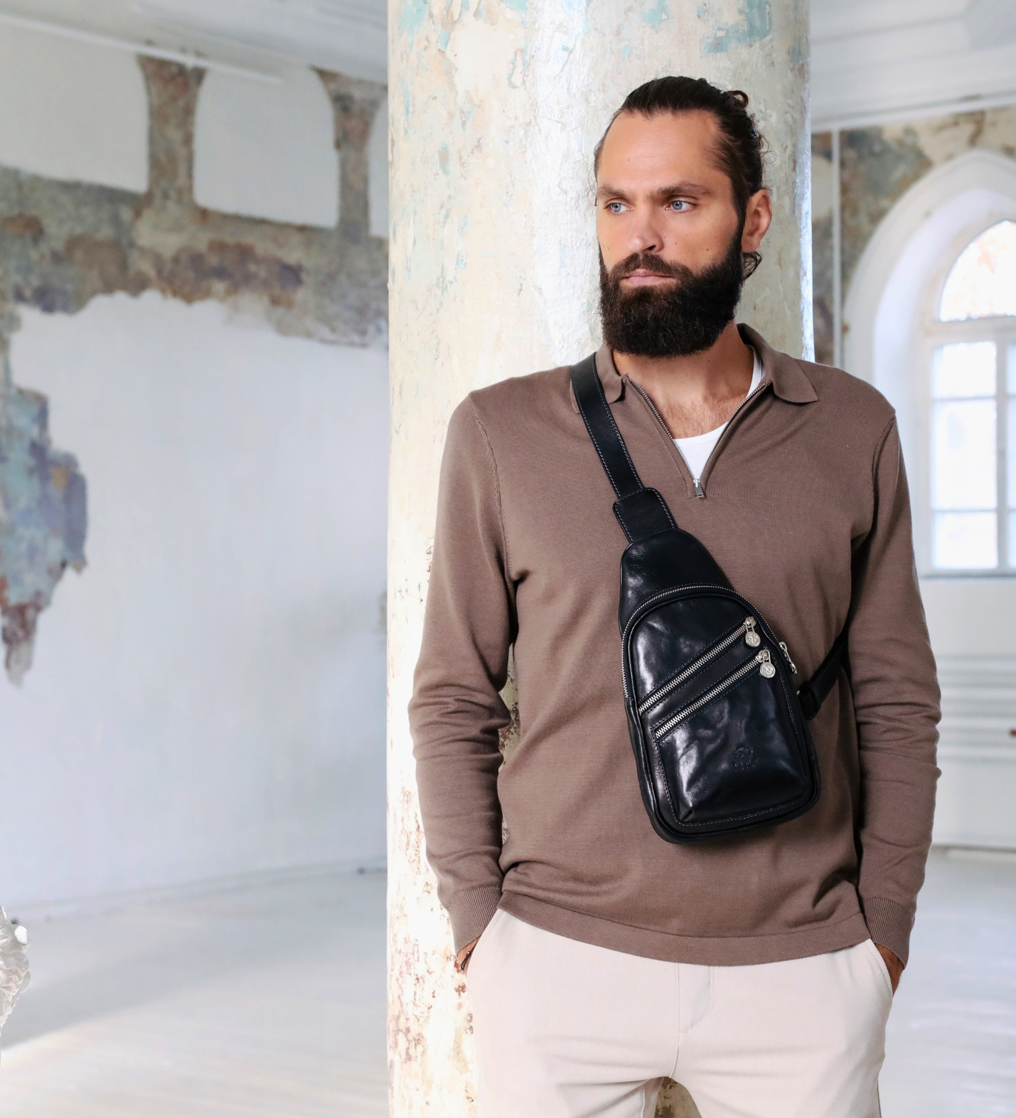Ta włoska torba typu sling została zaprojektowana z myślą o maksymalnym komforcie podróży. Nasza torba na klatkę piersiową Catch-22, wykonana z pełnoziarnistej skóry licowej, może być noszona na klatce piersiowej lub na plecach. Dopasowana do ciała torba typu nerka z najwyższej jakości skóry nie krępuje ruchów ani ducha podróży.