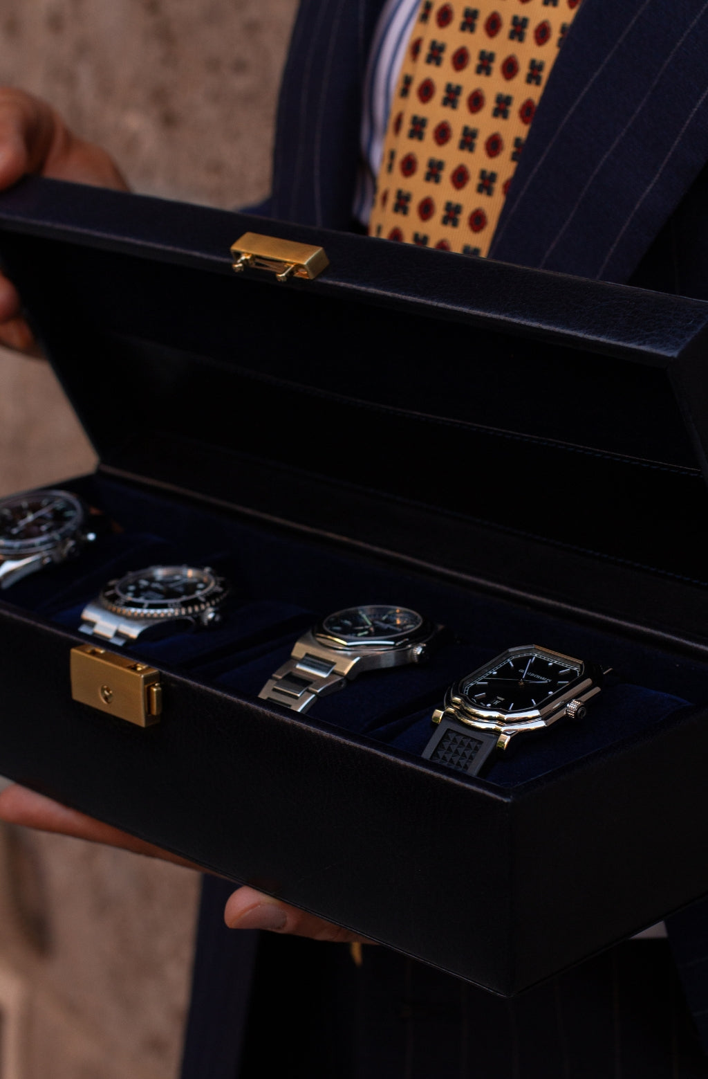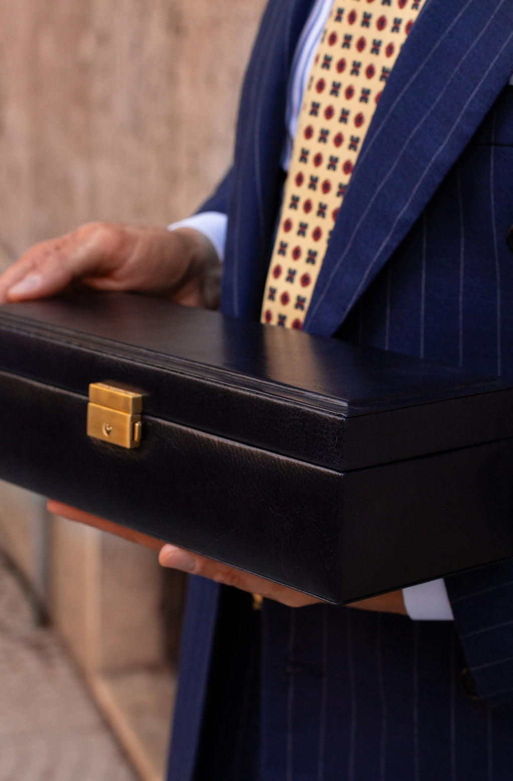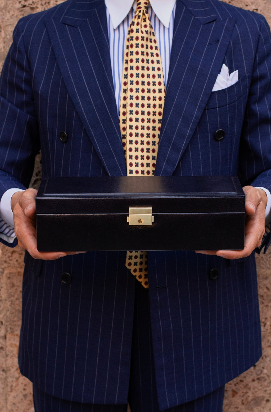 Skórzane pudełko na zegarki Herzog zapewni Państwa zegarkom bezpieczeństwo i ochronę. Wykonane z pełnoziarnistej, włoskiej skóry licowej i wyjątkowo miękkiego aksamitu, organizer posiada przegródki na cztery zegarki. Skórzana kieszeń idealnie nadaje się do przechowywania kilku pasków do zegarków lub bransoletek. Luksusowe etui na zegarki może być stylowym dodatkiem na komodzie lub chronić Państwa cenną kolekcję zegarków podczas podróży. Pudełko można spersonalizować, umieszczając na nim inicjały ukochanej osoby lub nawet ulubiony cytat.