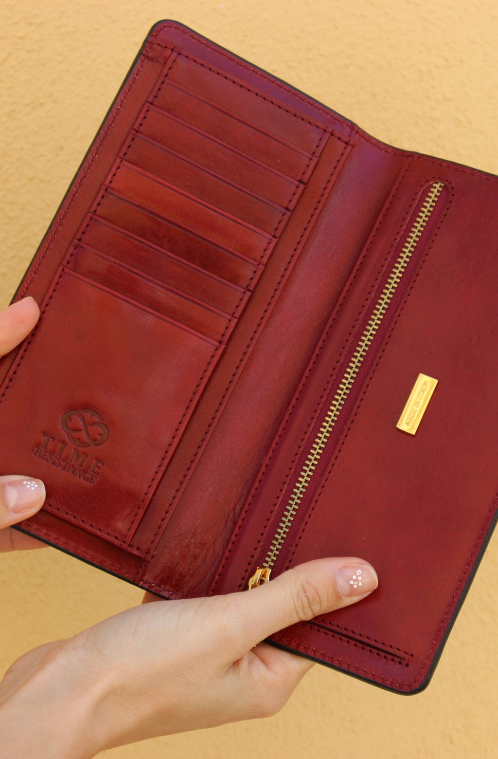 Time Resistance tworzy z włoskiej skóry licowej Vachetta: garbowanej roślinnie i barwionej ręcznie. Z czasem zyskuje szlachetną patynę.