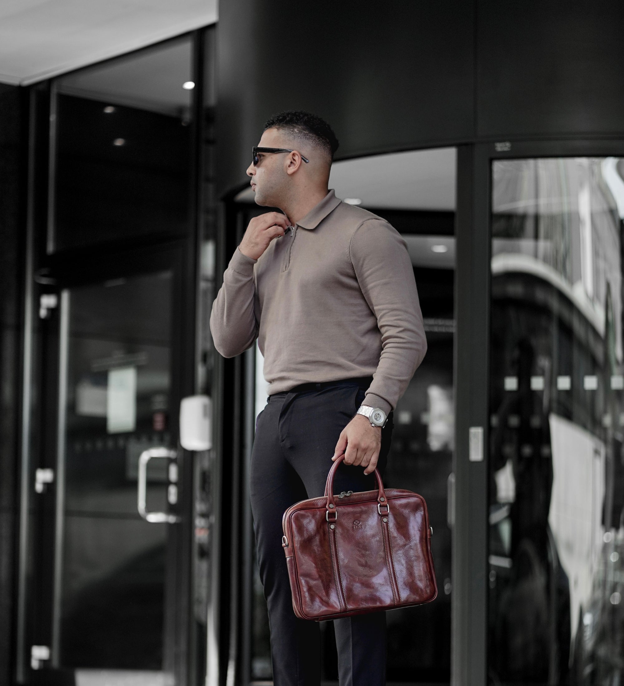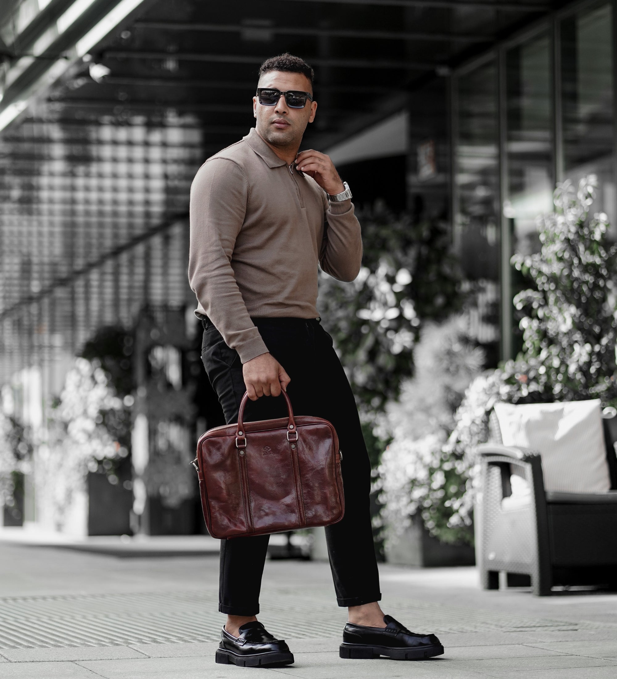This briefcase is perfect for just the essentials (and a bit more). First of all, it's super stylish in it's design (rather handsome looking), it's full-grain leather, vegetable tanned, made in Italy, and has strong hardware and YKK zippers. It's small, but a very sturdy and solid bag.