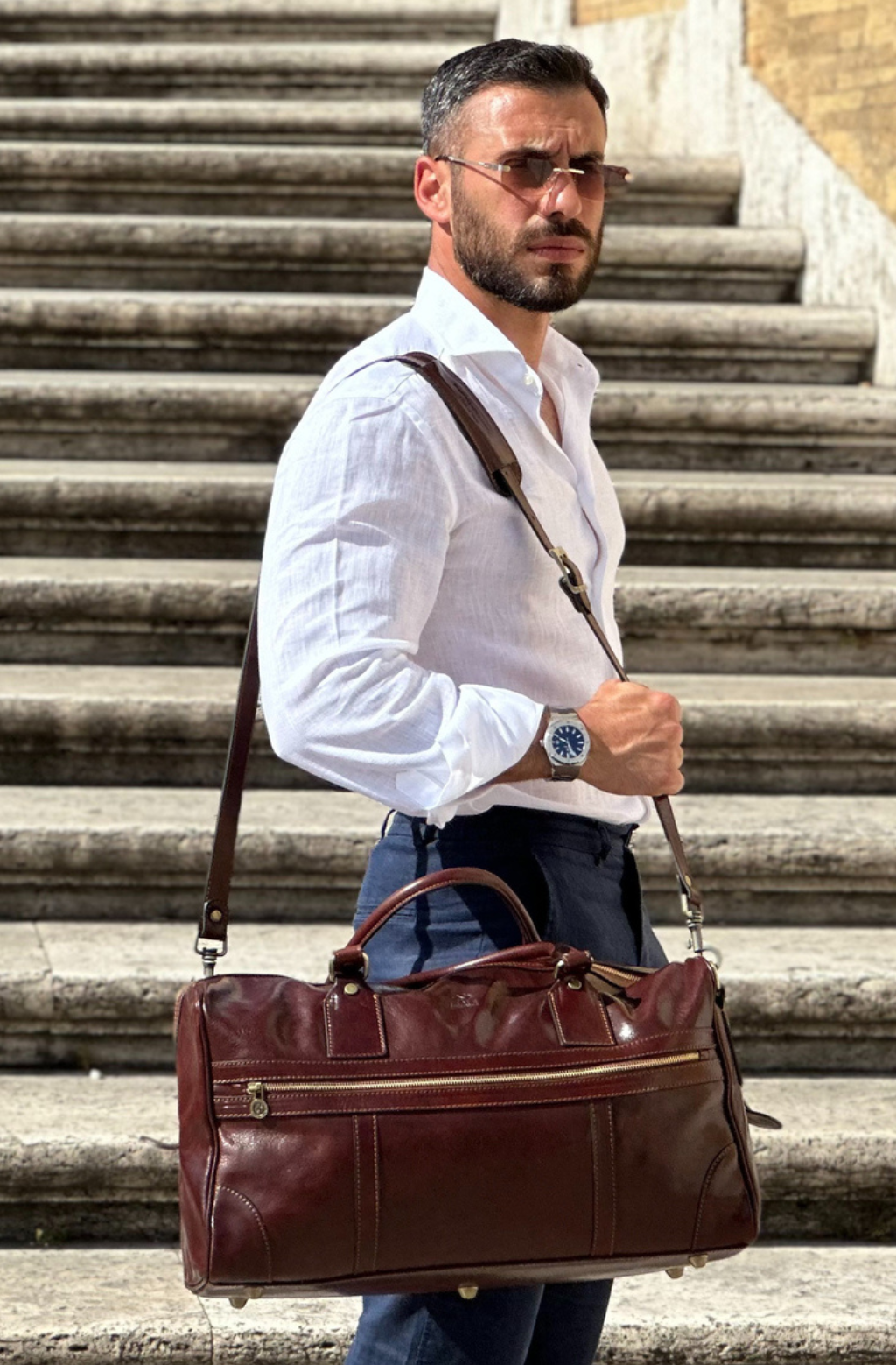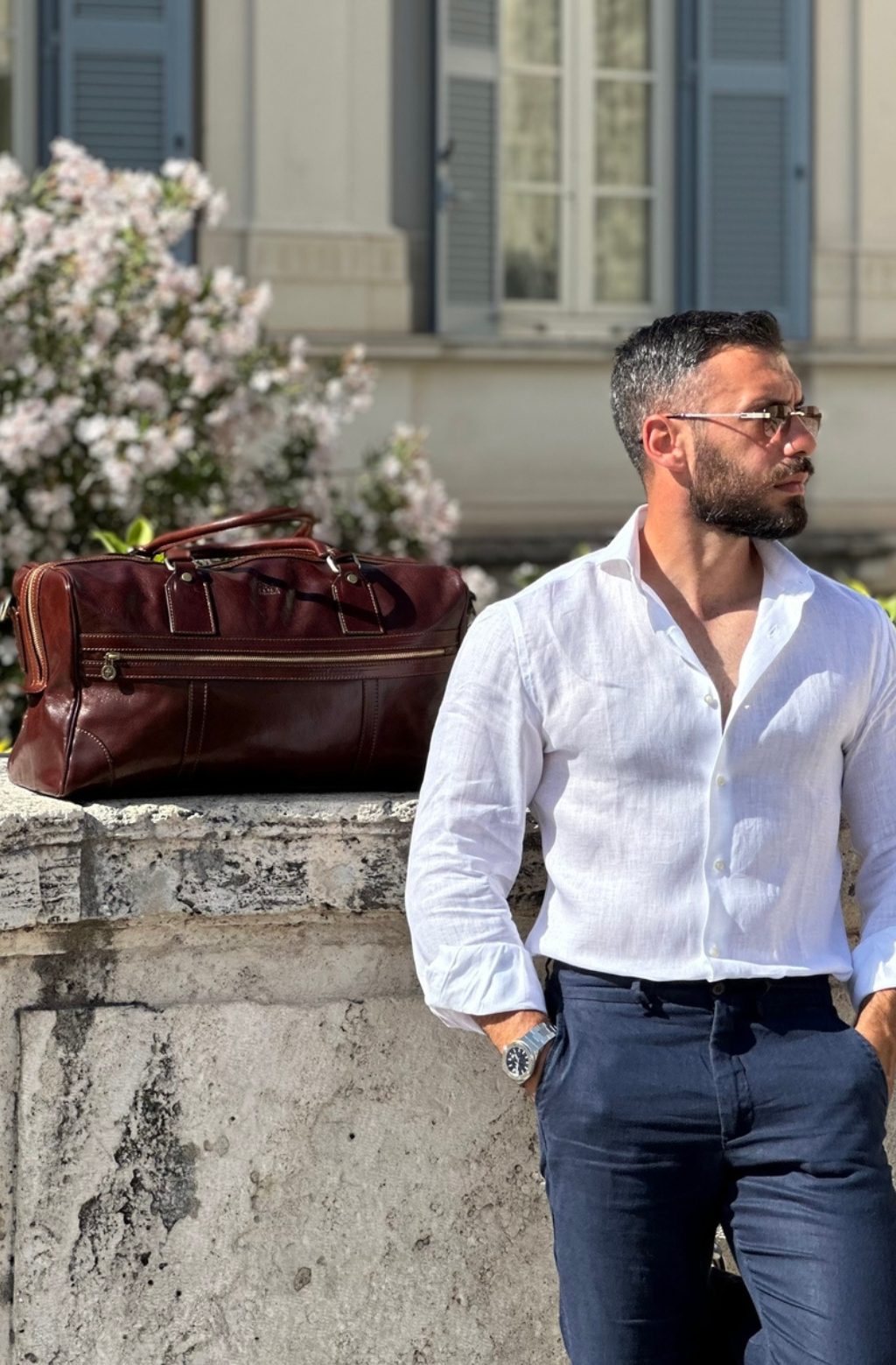 W mozaice podróży „To the Lighthouse” jawi się jako wierny towarzysz, cichy świadek czekających przygód. Wykonana z najwyższą starannością, jej solidna konstrukcja nie tylko sugeruje wytrzymałość, ale także zachęca do kolejnych podróży. Ozdobiona dwoma eleganckimi pionowymi skórzanymi paskami i wzmocnieniami w każdym rogu, łączy w sobie formę z funkcjonalnością, dodając odrobinę ponadczasowej elegancji do swojego projektu, a jednocześnie zapewniając dodatkowe wsparcie dla Państwa przedsięwzięć. W jej przestronnym wnętrzu, wśród dobrze znanych elementów, schronienie znajdują wspomnienia. Z każdym krokiem staje się czymś więcej niż tylko torbą; przekształca się w zaufanego powiernika, strażnika cennych chwil. Niech „To the Lighthouse” będzie Państwa wiernym towarzyszem podczas podróży po zawiłych ścieżkach życia, symbolem wytrzymałości pośród nieustannie zmieniających się krajobrazów wielkiej przygody, jaką jest życie.